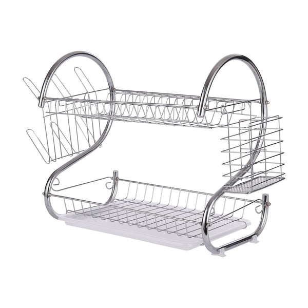 The two-tiered dish racks are constructed from heavy-duty chromed wire that besides being both durable and stable, resists rusting. The upper level holds plates and flatware while cups and mugs dry down below. The drying rack also has a removable utensil holder, glass holder and tray to catch any run-off water.