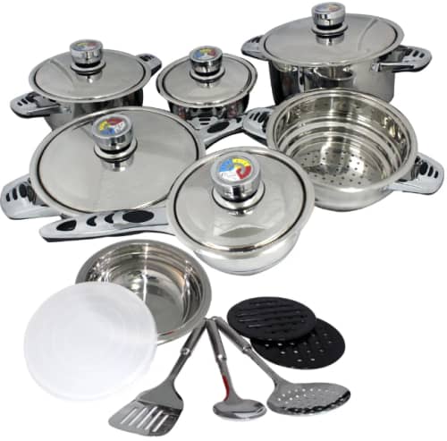 The Chukbok 19 Piece Stainless Steel Cookware Set is a great addition to any kitchen. This cookware set is top notch for catering to all of your cooking needs. Each piece in the cookware set is made from a high-grade quality of stainless steel. Each pot and pan is paired with a thermo-controlled lid.